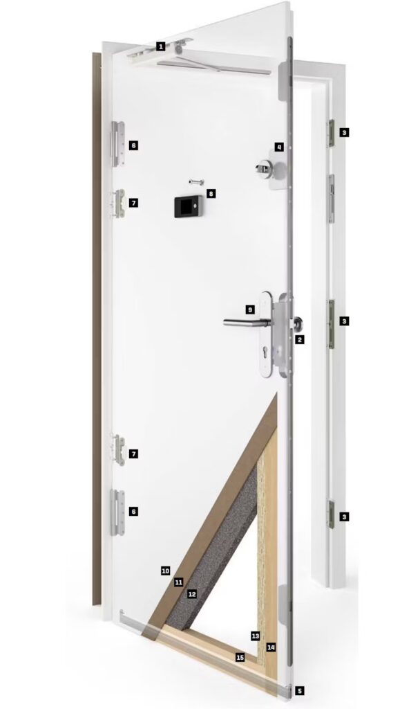Vchodové dvere sú vybavené špičkovými bezpečnostnými prvkami, ktoré zabezpečujú vysokú ochranu proti vlámaniu.